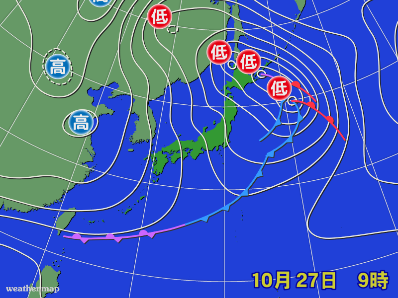 北海道付近で低気圧が発達し、日本付近は西から冬型の気圧配置となった。