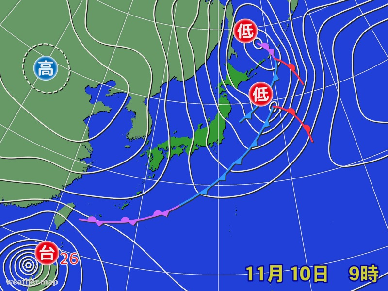 低気圧が日本の東で発達し、日本付近は次第に冬型の気圧配置となる。